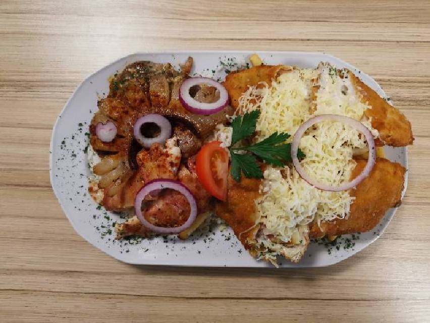 kacsamájjal és lilahagymával töltött sertésborda rántva, karaj rántva fűszeres tejföllel, kolbásszal, lilahagymával és sajttal, cordon bleu, rántott sajt, natúr csirke, rizs és hasáb